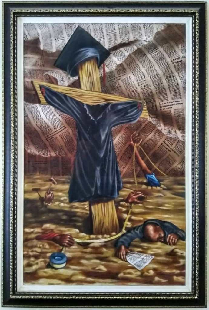 Ainsi se déploie toute la force symbolique du tableau de Shiler St-Éloi : la femme-territoire incarne un pays meurtri, attaqué de l’intérieur, consumé par des forces parasites. Le corps féminin devient métaphore d’une patrie vulnérable. La scène, d’une puissance tragique, transforme la souffrance nationale en vision plastique d’une intensité inoubliable.