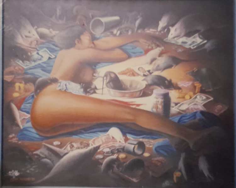 Je me souviens de l’image : une femme nue, allongée, dont le corps épouse parfaitement les contours de la carte d’Haïti. Sa silhouette devient territoire ; ses courbes dessinent les frontières, comme si la nation elle-même prenait chair. Mais cette chair est livrée à la dévastation : des rats la rongent, s’acharnant sur elle avec voracité. L’image est violente, presque insoutenable.